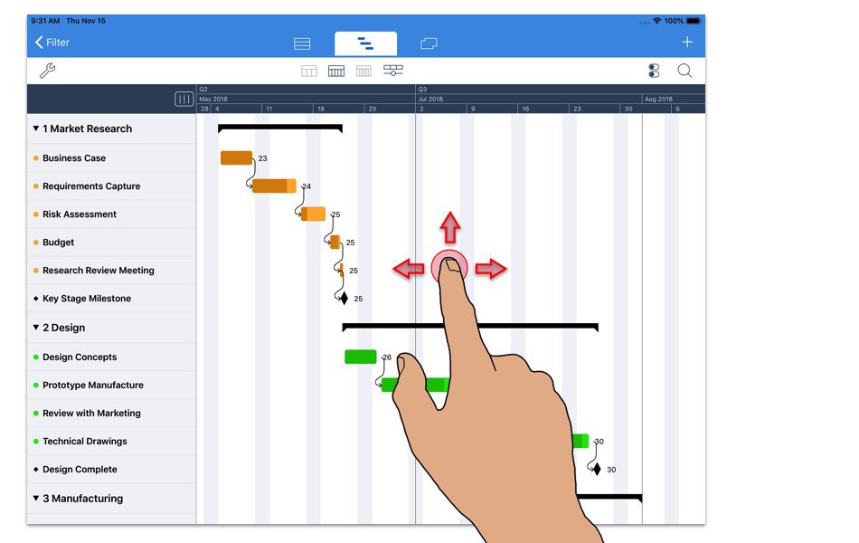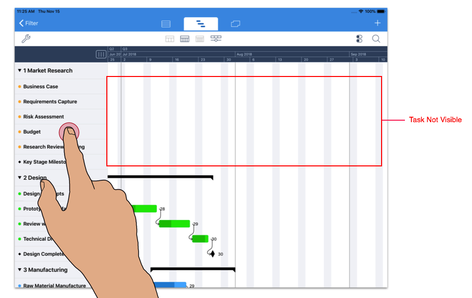 To scroll the view, tap and hold your finger on the Gantt view, and then move your finger in the direction you want to scroll.