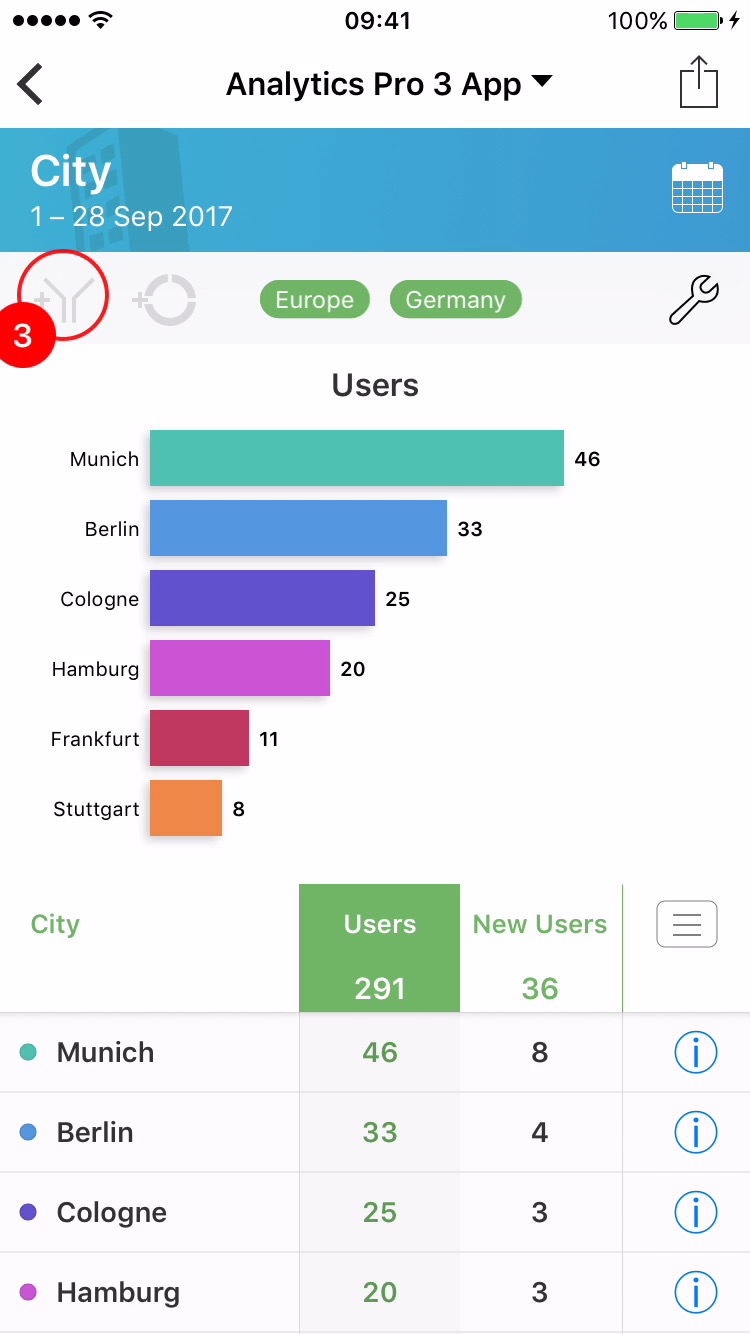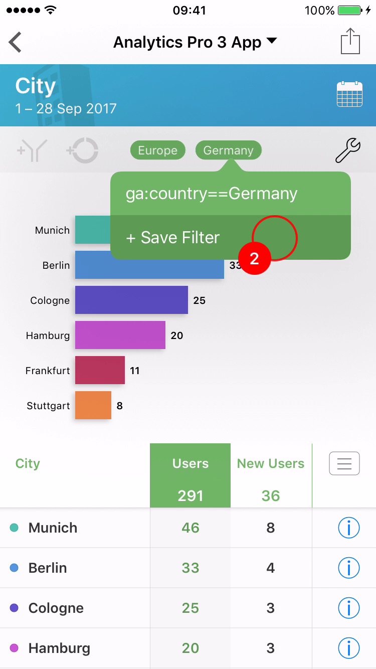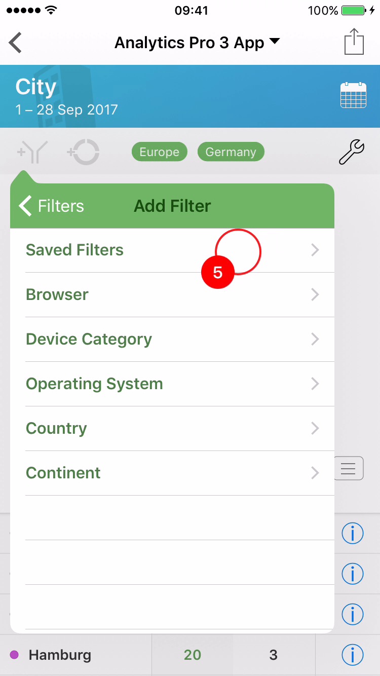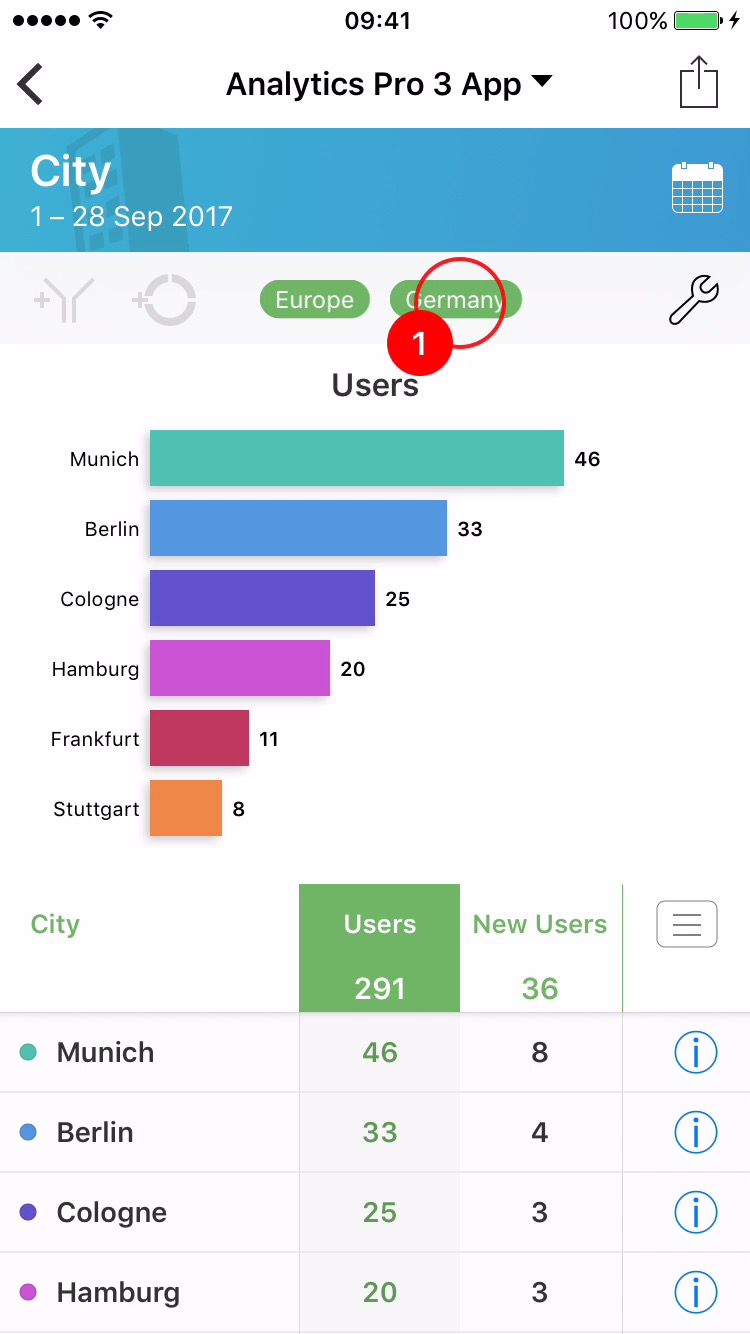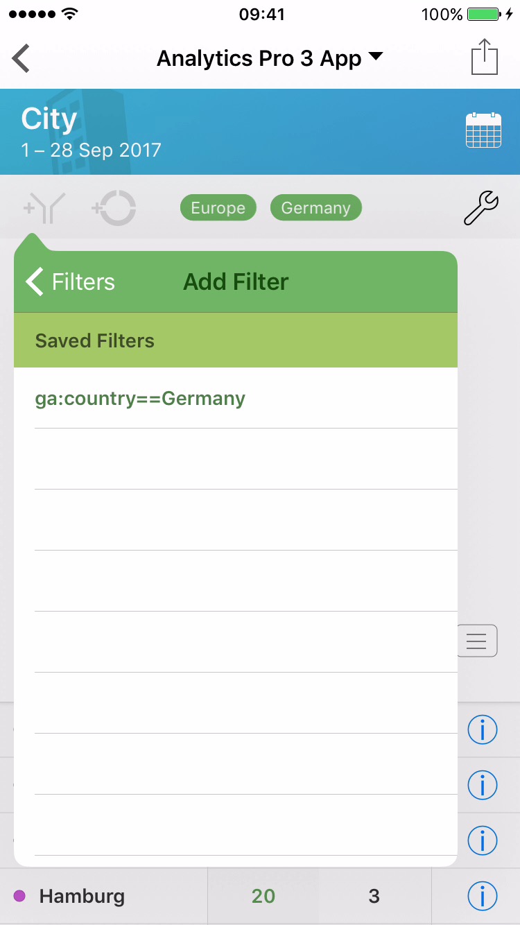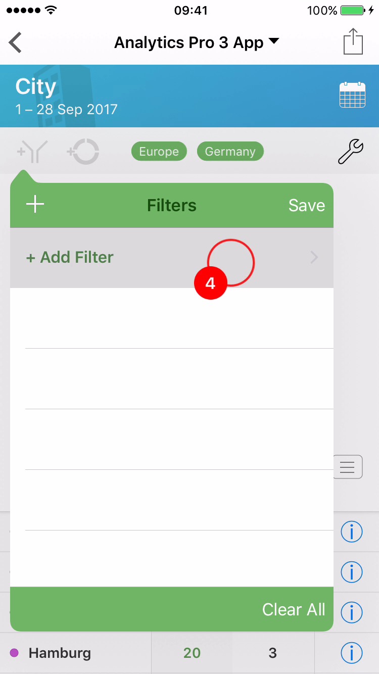 1Tap the name of the filter in the toolbar. In the Example above the filters 'Europe' and 'Germany' are present in the report.