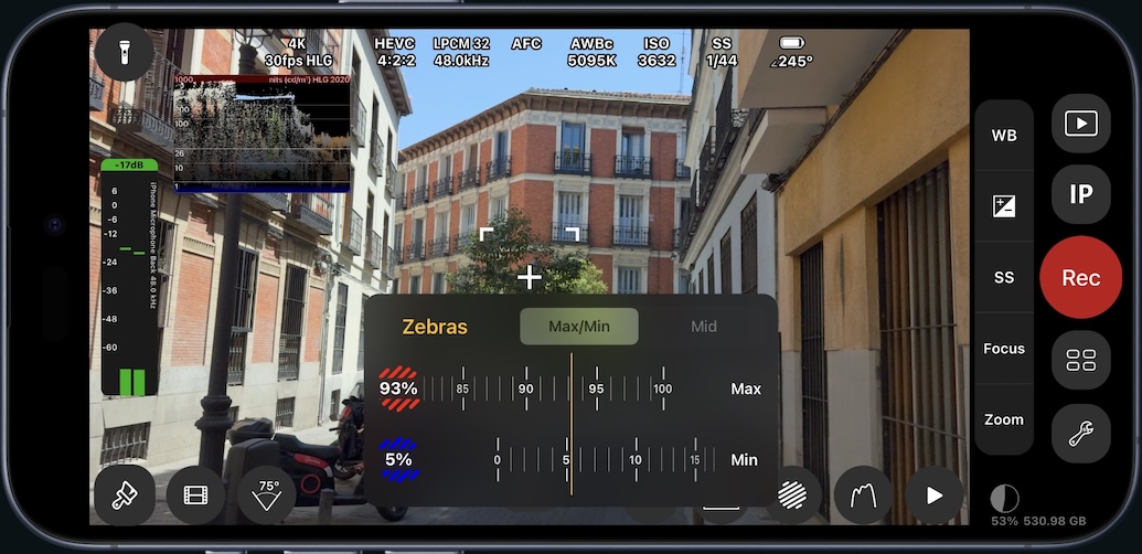 Full access to video color spaces, frame rate and resolutions including options not available in the standard Camera App.