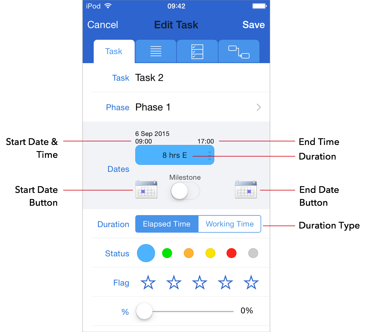 A task is defined as a unit of activity which occurs between two points in time, defined by a Start Date and an End Date. The Start Date and End Date include both a date and time component.