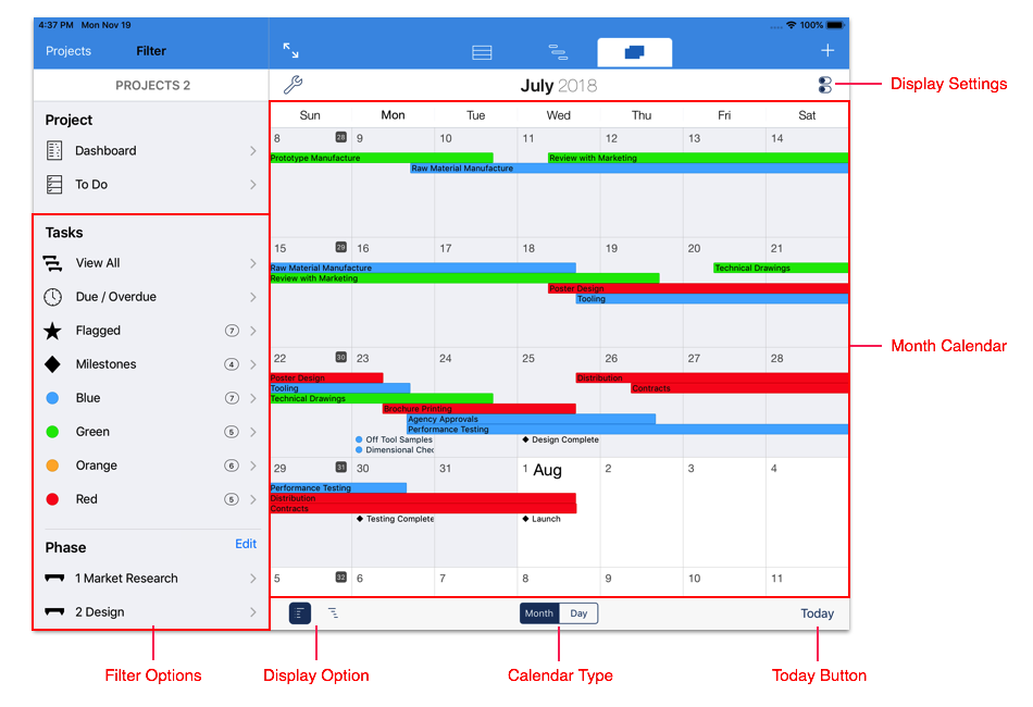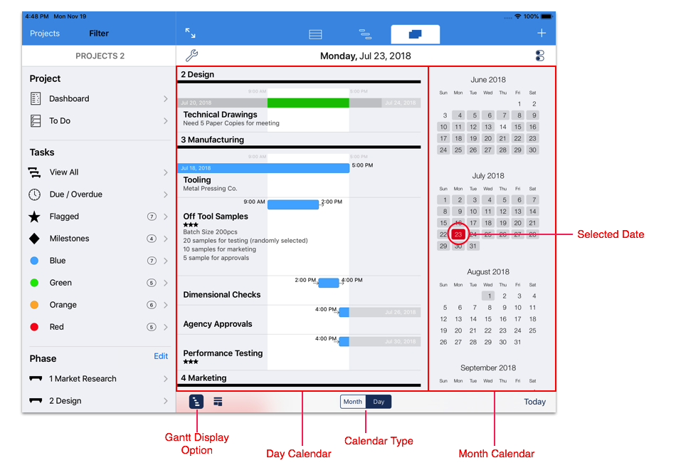 The image above shows the Day Calendar view with the Task Display Option selected. With this display option selected, the day calendar displays tasks that span multiple days in the top half with a Gantt style layout. Tasks which start and end on the same day are displayed in the lower half.