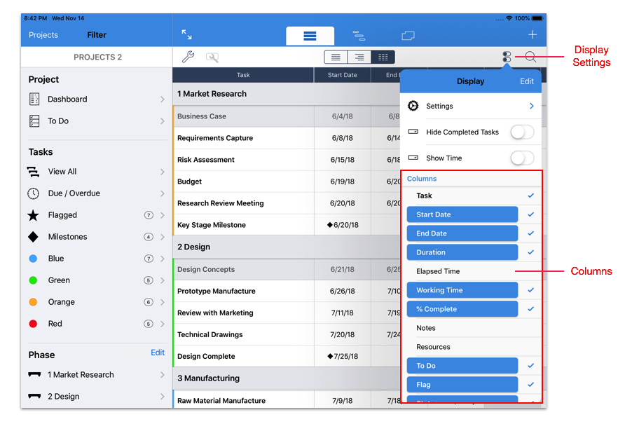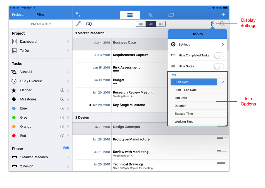 The ‘Info’ displayed on the Task list can be customized to display one of six different options. To change the information displayed, select the ‘Display Settings’ button and select an option from the ‘Info’ section of the ‘Display Menu’.