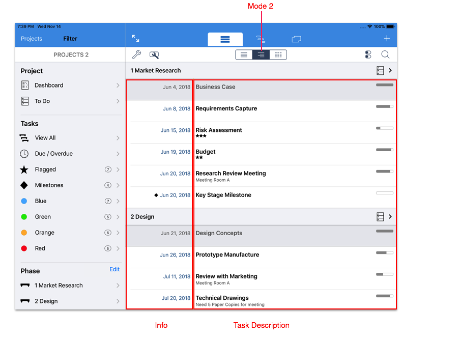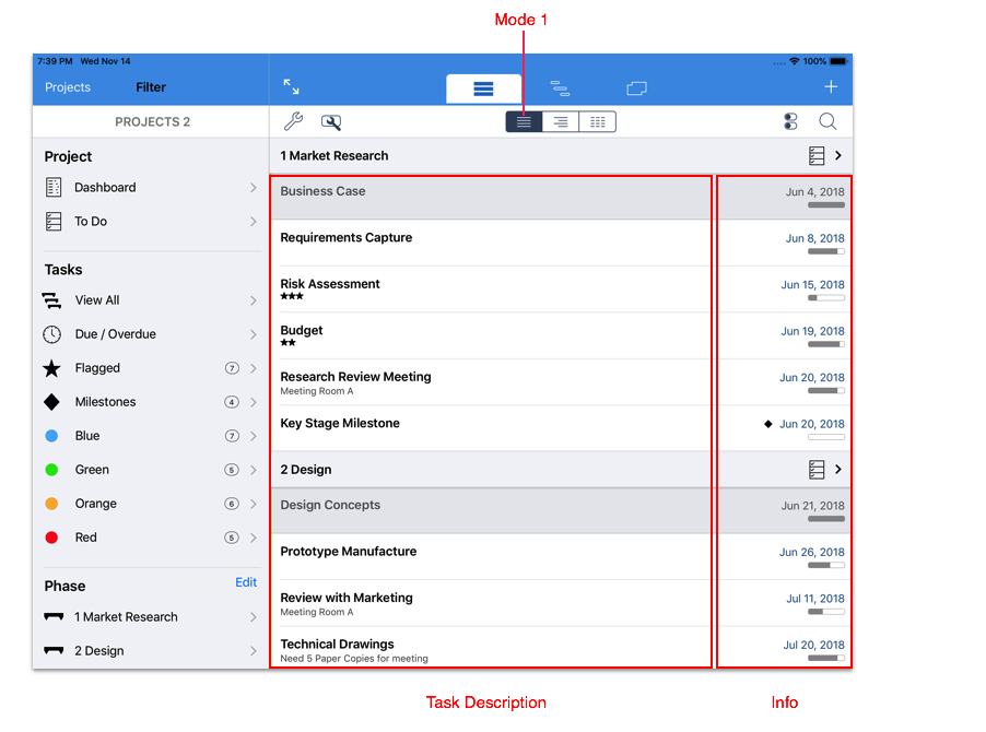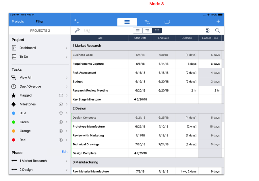 Mode 3 shown above is characterized by a spreadsheet style layout with the Task properties displayed in separate columns.