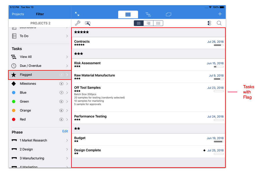 If an option such as 'Flagged' is selected, the main view will be filtered to show only those tasks which have a flag attribute assigned to them.