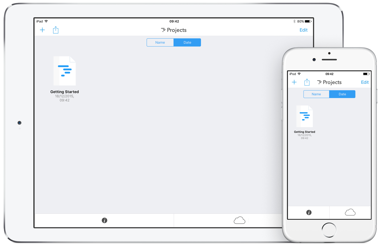 With iCloud a project created and edited on one device is automatically synchronized with other devices.