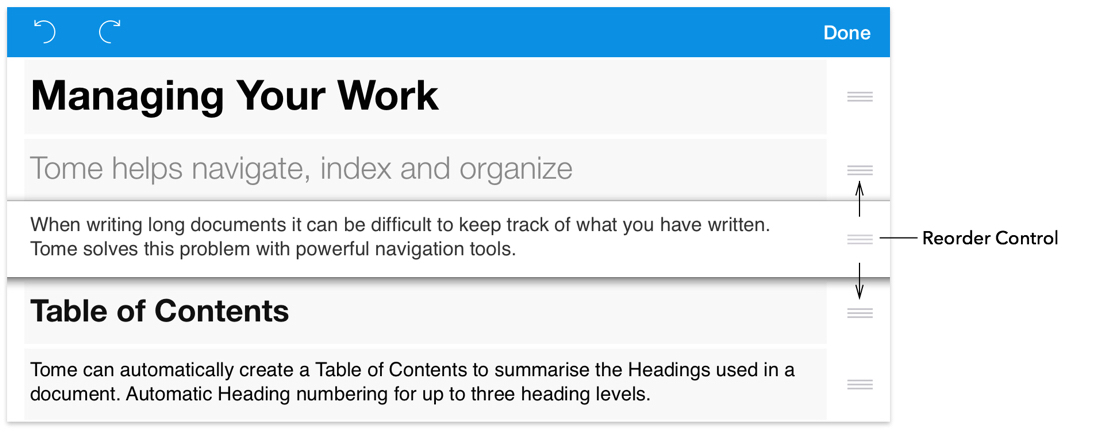 When writing long documents it can be difficult to keep track of what you have written. Tome solves this problem with powerful navigation tools.