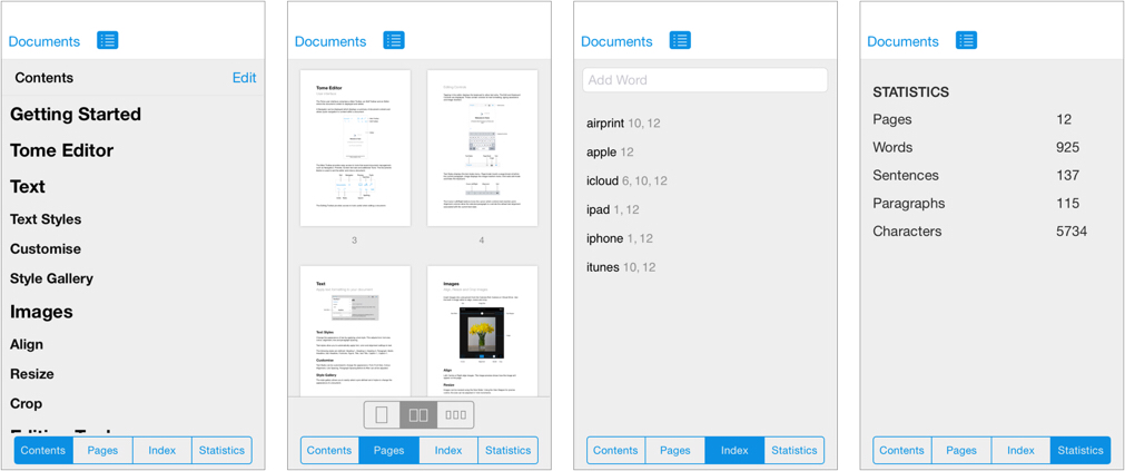 Viewable in 3 sizes the thumbnails also allow you to scroll the editor to a particular page by tapping on the page thumbnail.