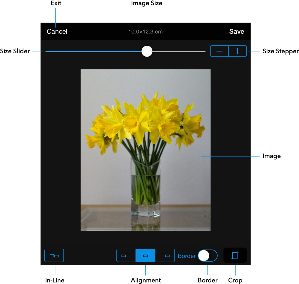 Insert images into a document from the Camera Roll, Camera or iCloud Drive. Use the built in image editor to align, resize and crop.