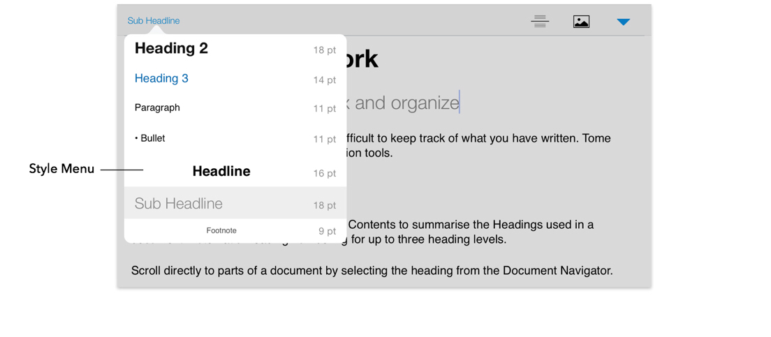 Scroll directly to parts of a document by selecting the heading from the Document Navigator.