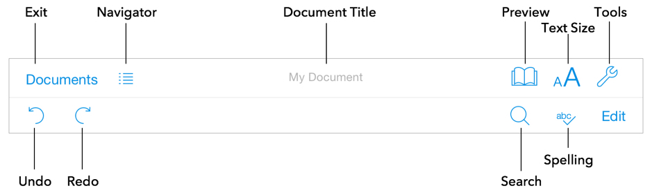 The Main Toolbar provides easy access to tools that assist document management, such as Navigation, Preview, Screen text size and additional Tools. The Documents Button is used to exit the editor and close a document.