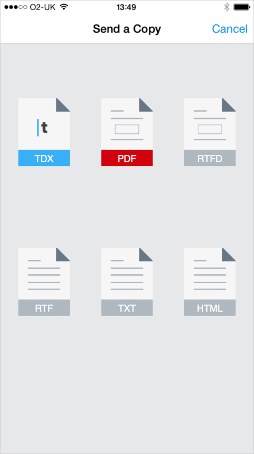 Files can be imported into Tome from Email attachments, iCloud Drive and from iTunes. Supported file formats include TDX, TXT and RTF.