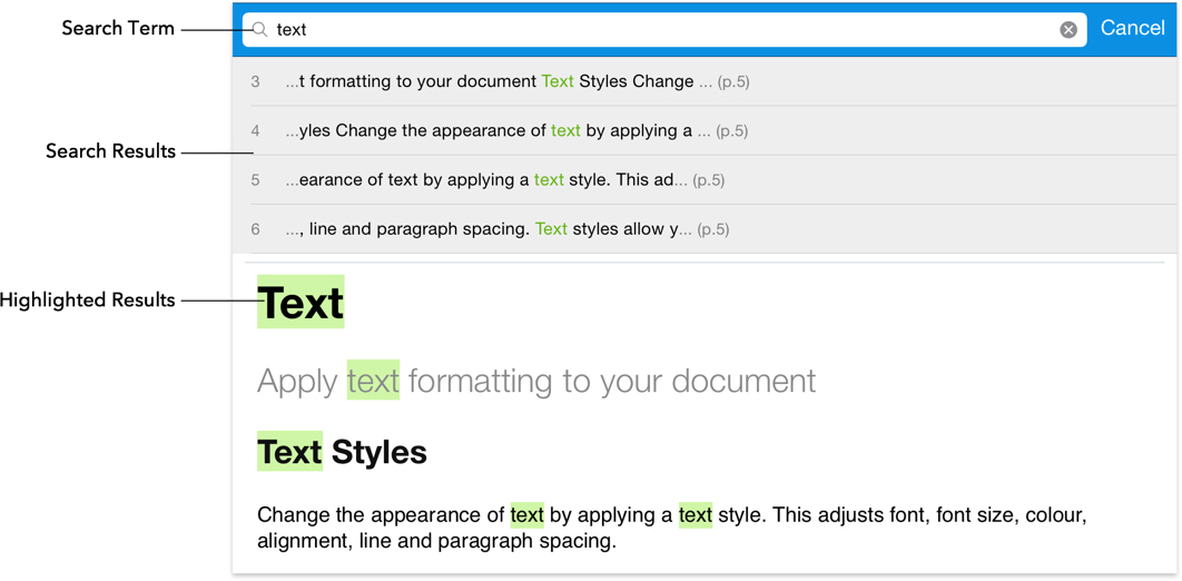 Find occurrences of words and characters in a document with keyword search. Tap a search result to scroll to it's location in the document.