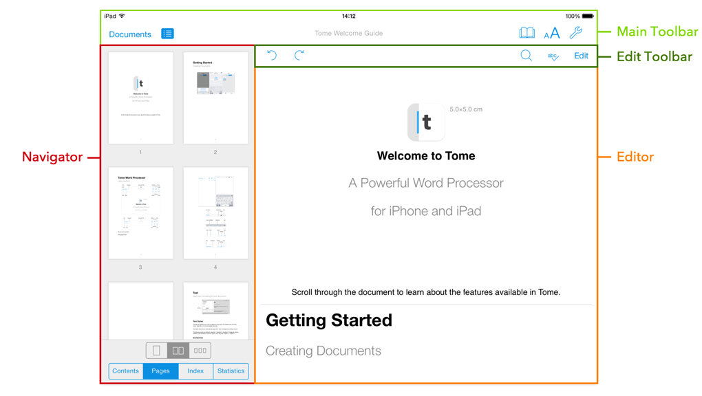 The Tome user interface comprises a Main Toolbar, an Edit Toolbar and an Editor where the document content is displayed and edited.