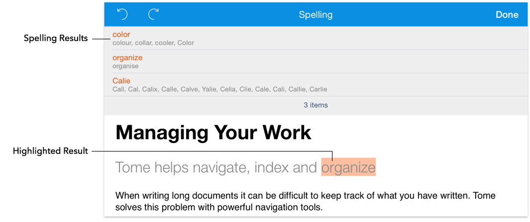 Tapping a spelling result will scroll to it's location in the document so that changes can be made.